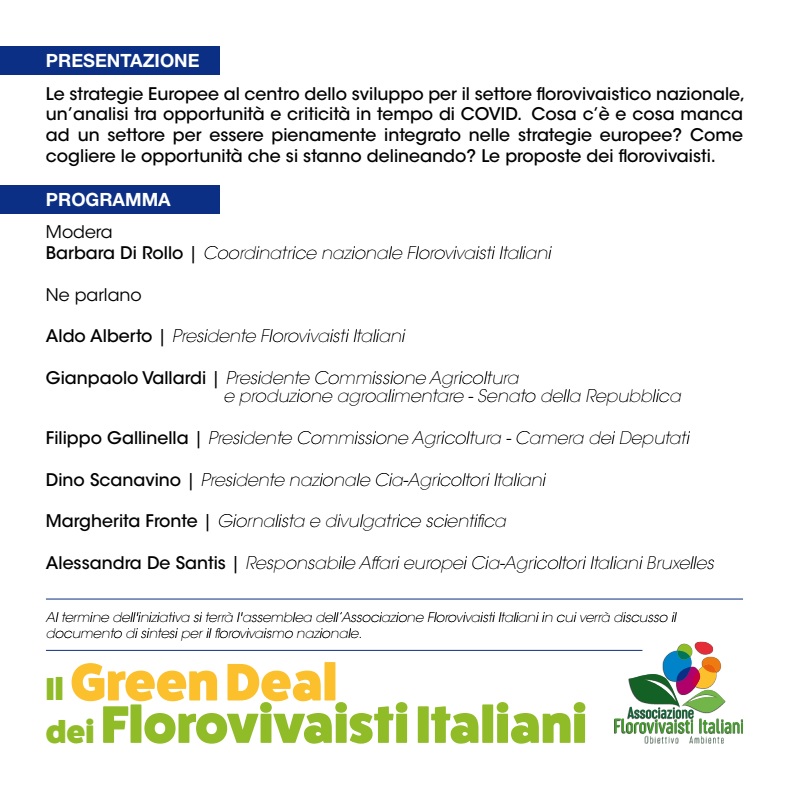 Le strategie Europee al centro dello sviluppo per il settore florovivaistico nazionale, un’analisi tra opportunità e criticità in tempo di COVID. Cosa c’è e cosa manca ad un settore per essere pienamente integrato nelle strategie europee? Come cogliere le opportunità che si stanno delineando? Le proposte dei florovivaisti.