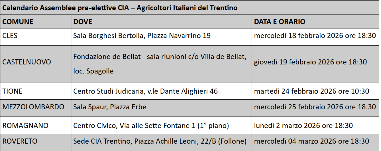 CALENDARIO ASSEMBLEE PRE-ELETTIVE CIA – AGRICOLTORI DEL TRENTINO