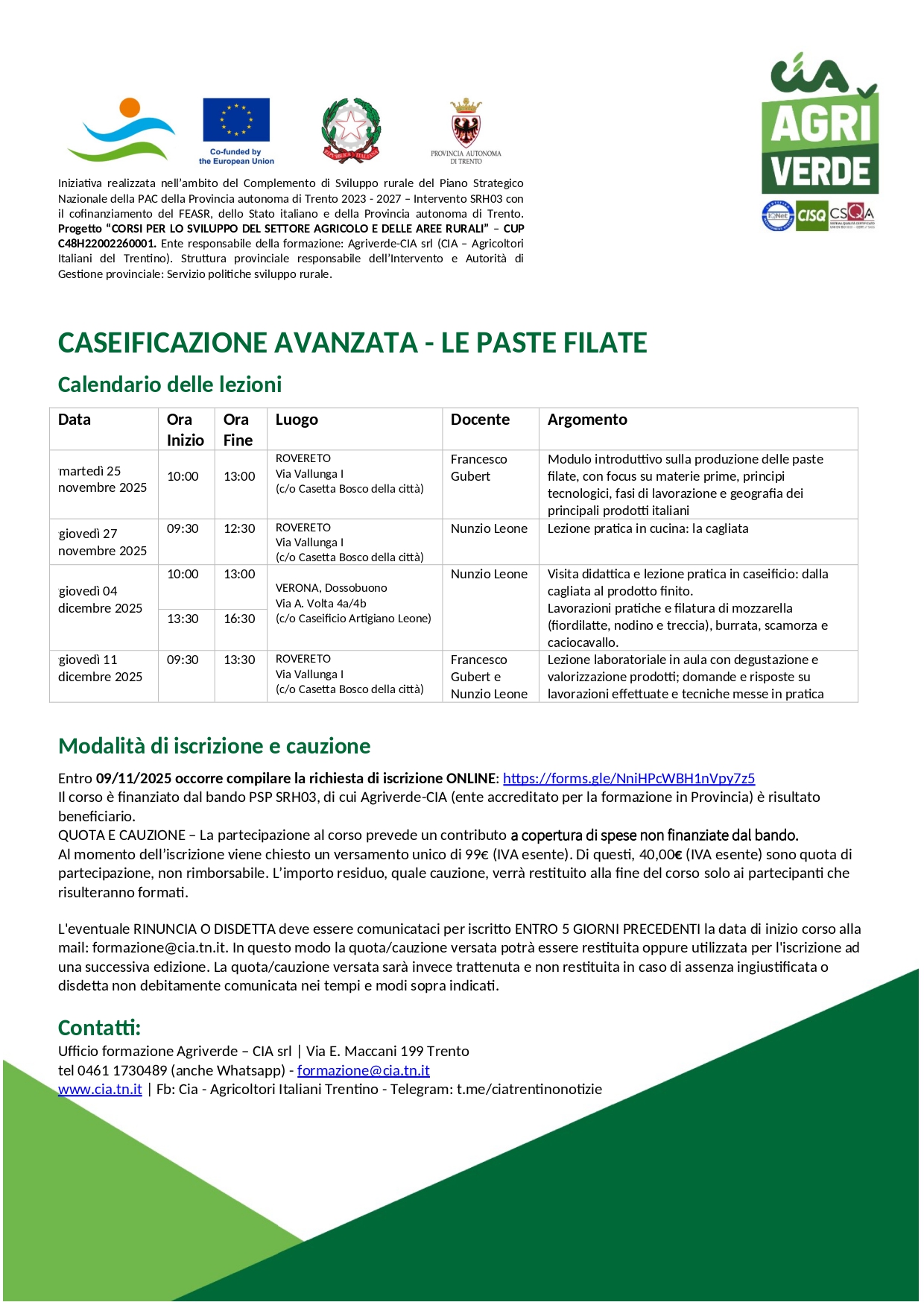 Al momento dell’iscrizione viene chiesto un versamento unico di 99,00€ (IVA esente), di questi 40,00€ (IVA esente) sono quota di partecipazione, non rimborsabile, a copertura di spese non previste da bando. L’importo residuo, quale cauzione, verrà restituito alla fine del corso solo ai partecipanti che risulteranno formati.* BANDO PSP SRH03 Iniziative realizzate nell’ambito del Complemento di Sviluppo rurale del Piano Strategico Nazionale della PAC della Provincia autonoma di Trento 2023 – 2027 – Intervento SRH03 con il cofinanziamento del FEASR, dello Stato italiano e della Provincia autonoma di Trento. Progetto “CORSI PER LO SVILUPPO DEL SETTORE AGRICOLO E DELLE AREE RURALI” – CUP C48H22002260001. Ente responsabile della formazione: Agriverde-CIA srl (CIA – Agricoltori Italiani del Trentino).