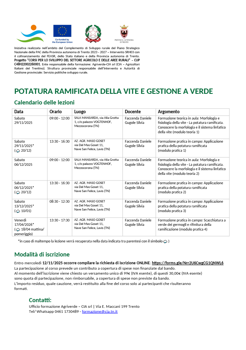 Al momento dell’iscrizione viene chiesto un versamento unico di 99,00€ (IVA esente), di questi 30,00€ (IVA esente) sono quota di partecipazione, non rimborsabile, a copertura di spese non previste da bando. L’importo residuo, quale cauzione, verrà restituito alla fine del corso solo ai partecipanti che risulteranno formati.* BANDO PSP SRH03 Iniziative realizzate nell’ambito del Complemento di Sviluppo rurale del Piano Strategico Nazionale della PAC della Provincia autonoma di Trento 2023 – 2027 – Intervento SRH03 con il cofinanziamento del FEASR, dello Stato italiano e della Provincia autonoma di Trento. Progetto “CORSI PER LO SVILUPPO DEL SETTORE AGRICOLO E DELLE AREE RURALI”CUP C48H22002260001. Ente responsabile della formazione: Agriverde-CIA srl (CIA – Agricoltori Italiani del Trentino).