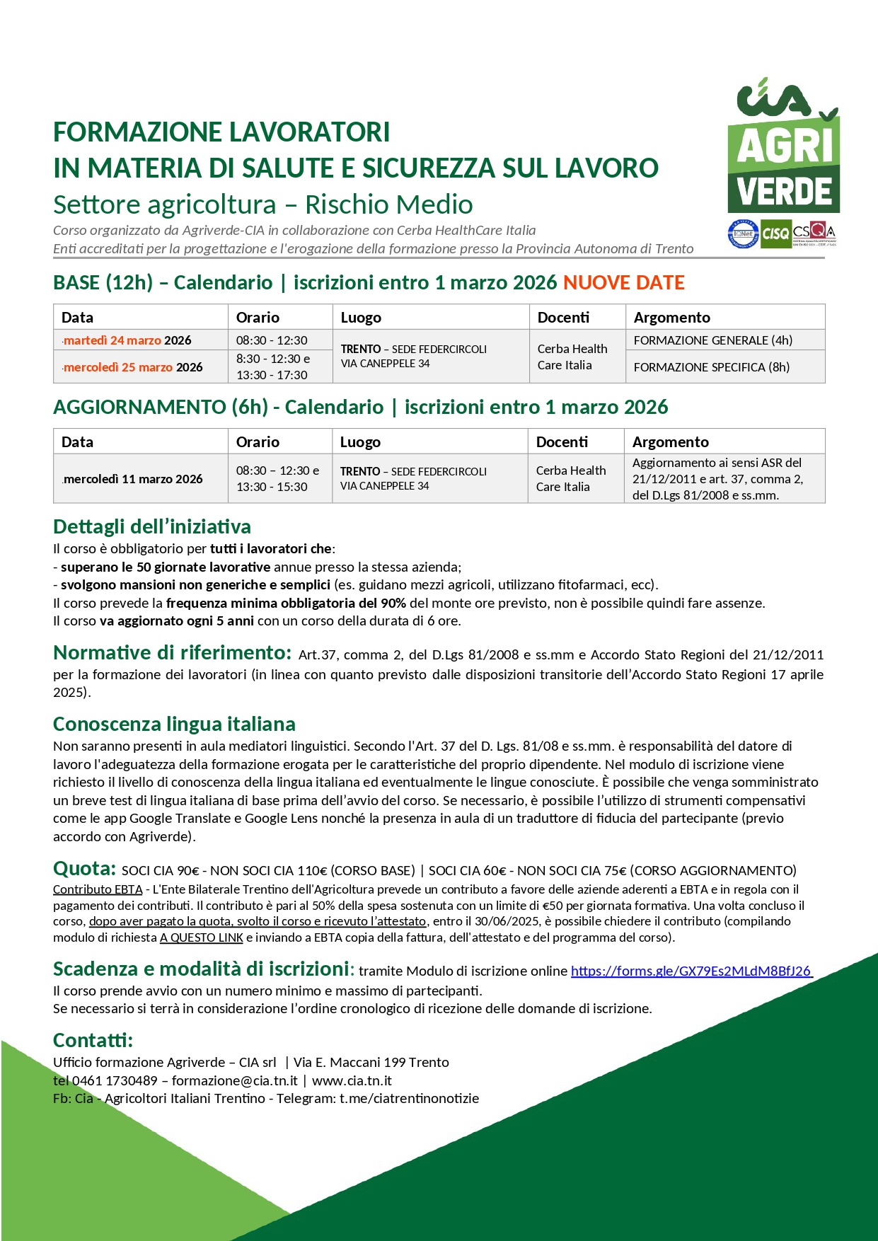 Info: 0461/1730489 formazione@cia.tn.it